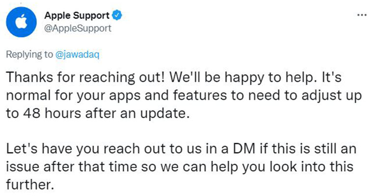 Από την άλλη δεν έχει περάσει αρκετός καιρός από την κυκλοφορία της ενημέρωσης έτσι ώστε να βγουν ασφαλή συμπεράσματα. Άλλωστε κάθε νέα ενημέρωση συνεπάγεται και με περισσότερη κατανάλωση μπαταρίας. Όπως υποστήριξε η ίδια η Apple μέσω Twitter, είναι φυσιολογικό για τις εφαρμογές και τα χαρακτηριστικά να χρειάζονται έως και 48 ώρες να προσαρμοστούν μετά την ενημέρωση. Μάλιστα κάλεσε όσους χρήστες εξακολουθήσουν να έχουν πρόβλημα μετά από αυτό το χρονικό διάστημα να επικοινωνήσουν με άμεσο μήνυμα με την εταιρία.