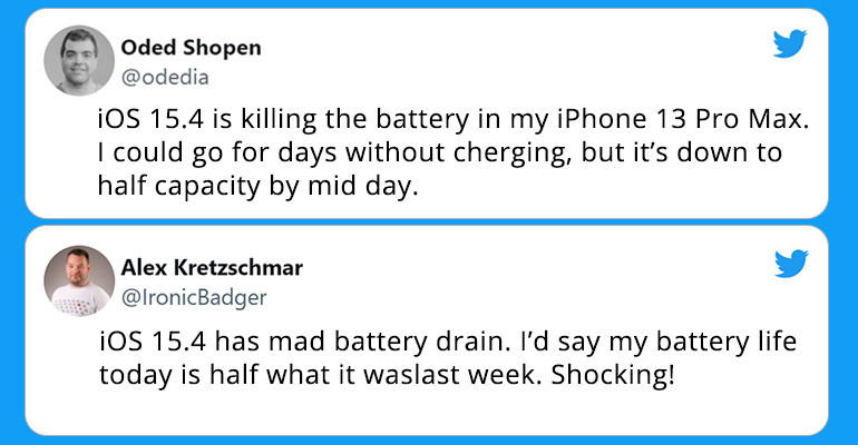 Παρόλα τα θετικά, οι χρήστες ισχυρίζονται ότι η μπαταρία τους εξαντλείται απρόσμενα γρήγορα, με τους χρήστες iPhone 13 Pro Max να αναφέρουν ότι η μπαταρία τους διαρκεί μόλις μισή μέρα! Οι χρήστες του Twitter που έβγαλαν το θέμα στην επιφάνεια, λένε ότι η ενημέρωση 15.4 σκοτώνει τη μπαταρία του iPhone 13 Pro Max. Πιο συγκεκριμένα, ότι ενώ η μπαταρία της συσκευής άντεχε για μέρες πλέον εξαντλείται στη μέση της μέρας, ή οτι επίδοση της μπαταρίας έχει πέσει στο μισό σε σχέση με πριν την ενημέρωση.