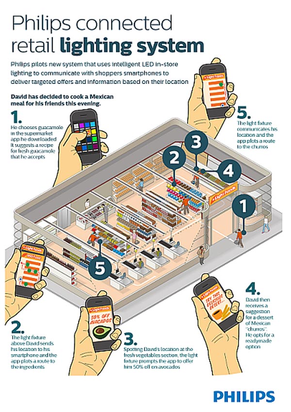 Το τμήμα φωτισμού της εταιρίας δημιούργησε ένα σύστημα πλοήγησης εσωτερικού χώρου με λάμπες φωτισμού LED και μέσα από το smartphone μας οδηγεί απευθείας στον διάδρομο που θέλουμε να πάμε. Επιπλέον στέλνει προσφορές ανά κατηγορίες προϊόντων απευθείας στο κινητό όσων εκείνη τη στιγμή βρίσκονται και ψωνίζουν μέσα στο κατάστημα.