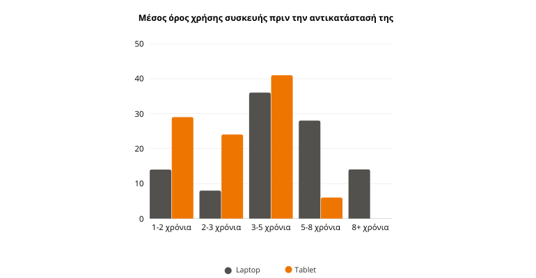 Οι Έλληνες καταναλωτές τείνουν να χρησιμοποιούν τη συσκευή της τηλεόρασης για πάνω από 8 χρόνια πριν την αντικαταστήσουν, σε αντίθεση με τη χρήση που κάνουν σε tablet και laptop, στα οποία παρατηρείται παρόμοια τάση, αντικατάστασής τους δηλαδή στα 3-5 χρόνια χρήσης. Υπάρχει και ένα σημαντικό ποσοστό ανθρώπων βέβαια, που προτιμούν αν αντικαταστήσουν το tablet τους στα πρώτα 2 χρόνια χρήσης, σε αντίθεση με το laptop που μπορεί να φτάσει τα 5-8 χρόνια χρήσης πριν την αντικατάστασή του.