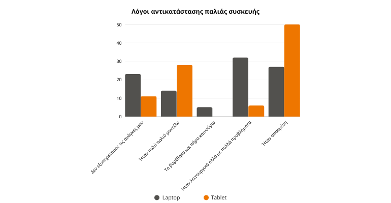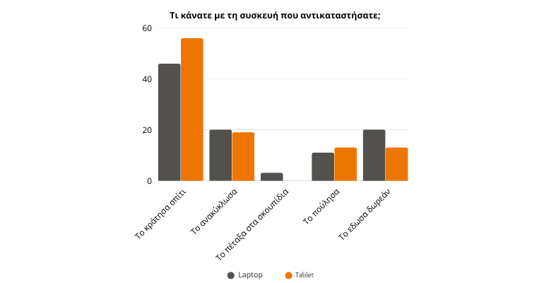 Όπως φαίνεται στα γραφήματα, τα δημοφιλή κίνητρα αντικατάστασης σχετίζονται με τη λειτουργικότητα της συσκευής (“λειτουργία με προβλήματα” και “επειδή χάλασε”) ακολουθούμενη από λόγους που είχαν να κάνουν με τις ανάγκες των καταναλωτών («δεν κάλυπτε τις ανάγκες μου») και λόγω του παλιού μοντέλου της συσκευής. Σε αυτό το σημείο, πρέπει να αναφερθεί ότι οι αποφάσεις των καταναλωτων για αντικατάσταση, επισκευή, αποθήκευση ή απόρριψη συσκευών επηρεάζονται από την απαξίωση του προϊόντος, είτε πραγματική (φυσική, λειτουργικά, τεχνικά) ή για ψυχολογικούς και κοινωνικούς λόγους.