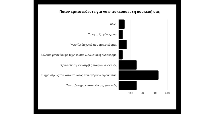 Συνολικά, το 82% απάντησε ότι η τιμή που πλήρωσαν για την αγορά μιας συσκευής επηρεάζει την απόφασή τους να την επισκευάσουν. Σχετικά με το σέρβις επισκευής που εμπιστεύονται, υπέδειξαν μέσω των απαντήσεών τους το τμήμα σέρβις του καταστήματος αγόρασε τη συσκευή (34,4%) και το εξουσιοδοτημένο σέρβις της μάρκας (32,8%) στην πλειοψηφία τους.
