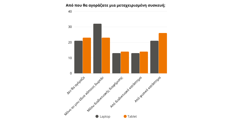 Στο σύνολό της η πρόθεση των Ελλήνων καταναλωτών να αγοράσουν και να χρησιμοποιήσουν μεταχειρισμένους φορητούς υπολογιστές, tablet ή τηλεοράσεις τείνει να είναι αρνητική, αλλά όχι εντελώς αντίθετη. Η αιτιολόγηση αυτής της τάσης εμφανίζεται από το ποσοστό αυτών που θα αγόραζαν και δεν θα αγόραζαν καθόλου μια μεταχειρισμένη συσκευή, όσο αυτοί που θα είχαν μια μεταχειρισμένη συσκευή μόνο αν κάποιος τους το δώσει δωρεάν (κάτι που έδειχνε πρόθεση για επαναχρησιμοποίηση).